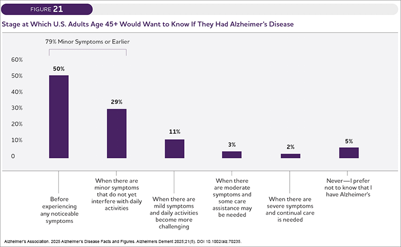 • Nearly 4 in 5 Americans (79%) would want to know if they had Alzheimer’s disease before experiencing symptoms or before symptoms interfere with daily activities.