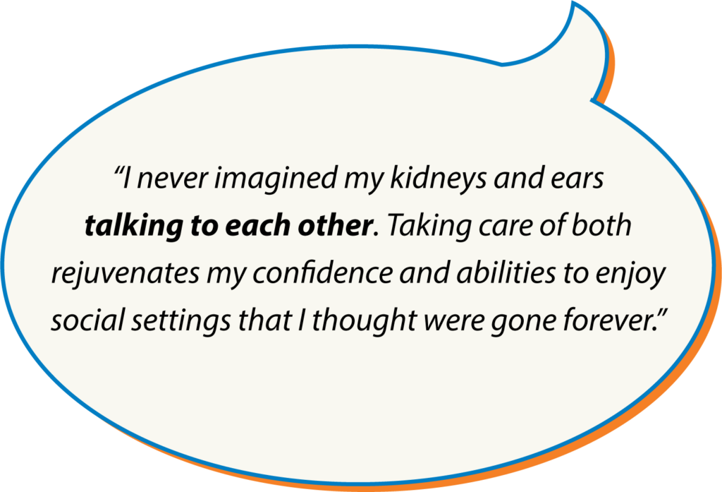 Meet Linda, a 50-year-old patient with an active lifestyle, who came in last year for her annual hearing check. During the health history update, her recent kidney disease diagnosis came to light. Despite daily frustrations with communication challenges, little did she know about its potential connection to gradual hearing loss. After raising awareness of this causal link, Linda’s Care Team, including her hearing care professional, nephrologist and primary care Doctor, harmonized clinical efforts.